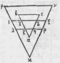 (59) Δια γεωμετρικών σχημάτων αναλόγων θα δειχθή πώς εισαγεται αναλογία εν τη ψυχή μεταξύ των παραστάσεων των αντικειμένων και αυτών των αντικειμένων, και ότι είται τα πράγματα είτε τας εικόνας των θεωρήσωμεν, αι αναφοραί μένουσιν αι αυταί, και η ψυχή δύναται να κρίνη περί των μεν όσov και περί των δε. Εκ των δύο τριγώνων το μικρότερον και εσωτερικόν αβε παριστά τα πράγματα, α voεί η ψυχή, το δε μεγαλείτερον και εκτός είναι ο χρόνος, ον αντιλαμβάνεται ομού με τα νοήματα. Αποδεικνύεται δε ότι “μνημονεύοντες ή αναμιμνησκόμενοι εξ ανάγκης και τον πληρούντα χρόνον συνεννοούμεθα” (Θεμίστιος).