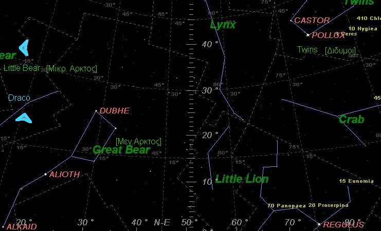 Ανάμεσα στην Μεγ. Αρκτο και τον Ωρίωνα, παρεμβάλλονται τα ζώδια ΛΥΓΚΕΥΣ και ΔΙΔΥΜΟΙ. Οι Δίδυμοι είναι δίπλα στον Ωρίωνα. Ο Κάστωρ και ο Πολυδεύκης ήταν τα δυο αδέλφια της Ελένης, που πάντα την προστάτευαν.