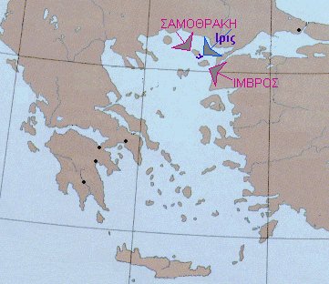 Και άμ’ άκουσ’ ετινάχηκεν η ανεμόποδ’ Ίρις και κει της Σάμου ανάμεσα και της τραχείας Ίμβρου έπεσε μες στη θάλασσαν κι εγόγγυσεν ο κόλπος, και μες στα βάθη εβύθισεν ωσάν την μολυβήθραν, οπού με ταύρου κέρατα δεμένη κατεβαίνει στα ωμοφάγα ψάρια τον θάνατον να φέρει.
