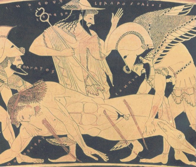 Λεπτομέρεια από τον περίφημο κρατήρα του Ευφρονίου. Στην κύρια όψη του αγγείου παριστάνεται ο Σαρπηδών νεκρός, να τον παίρνουν ο Ύπνος και ο Θάνατος. Προσέξτε το θαυμάσιο σχέδιο της παράστασης και την εξαίρετη ομορφιά του ξανθού νέου. Το αίμα τρέχει ακόμη ποτάμι από τις πληγές του.